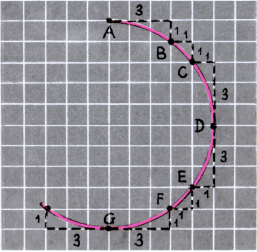 касалась горизонтальной линованной прямой в точке $A$). Затем из $B$ идите к $C$, говоря: один — один (одна клетка вправо и одна вниз) и, наконец, — от $C$ к $D$, говоря: один — три. Линия $ABCD$ — это четверть