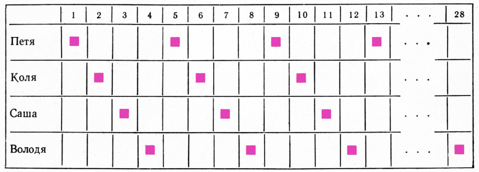 Пример 3. Петя, Коля, Саша и Володя живут в комнате общежития. На февраль они установили такой график дежурств: