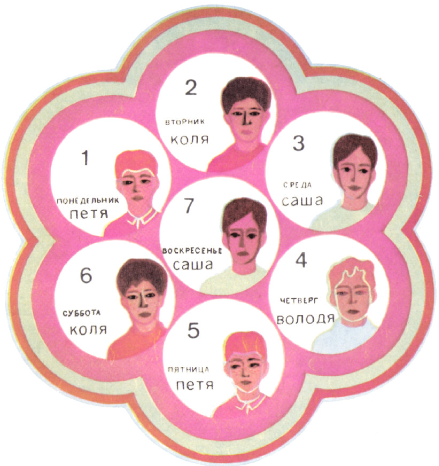 функцией дня недели. Так как дней недели семь, а мальчиков четыре, то мы нарисовали
