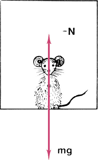 $N$. Тогда на мышь со стороны коробки действует сила$-N$ (реакция коробки). Так как коробка, а вместе с ней и мышь, движется с ускорением свободного падения$g$, то уравнение движения (второй закон Ньютона) запишется для мыши так:$mg-N=mg$. Из этого уравнения справедливого, естественно, для всего времени движения коробки, найдём, что$N=0$, т. е. мышь находится в состоянии невесомости. - Одновременно, так как количество тепла, которое нужно сообщить воде в обоих случаях, одно и то же.