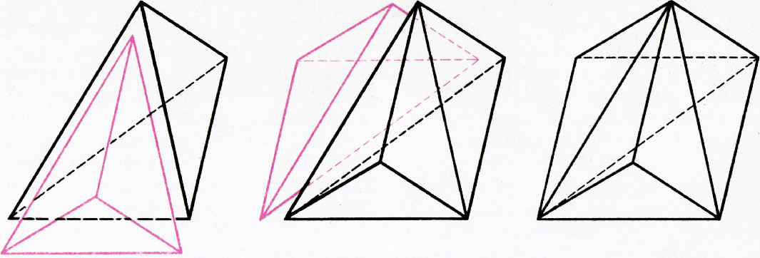 Сначала он доказал теорему, что две пирамиды, имеющие равновеликие основания и равные высоты, имеют один и тот же объём. Здесь для него не было никаких осложнений — пирамиды с одинаковой высотой состояли, по Демокриту, из равного числа соответствующих треугольников, причём их объёмы были суммами «объёмов» треугольников (ведь, по Демокриту, треугольники были материальными, имели минимальную толщину). Поскольку площади оснований обеих пирамид были одинаковы, то «объёмы» соответствующих треугольников в обеих пнрамидах совпадали, и потому совпадали и объёмы пирамид. А потом он делил трёхгранную призму на три пирамиды, имеющие попарно одну и ту же высоту и равновеликие основания (см. рисунок). Таким путём Демокрит «доказывал», что объём пирамиды равен одной трети объёма призмы, имеющей ту же высоту и то же основание. А равенство объёмов пирамиды и конуса, имеющего ту же высоту и то же по площади основание, доказывалось уже совсем просто — они состояли из одинакового количества фигур одного и того же «объёма».