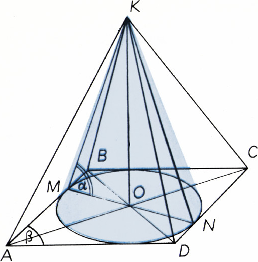$l$, угол образующей с плоскостью основания равен$\alpha$. Найти объём описанной около конуса пирамиды, основанием которой служит ромб с острым углом$\beta$. - За