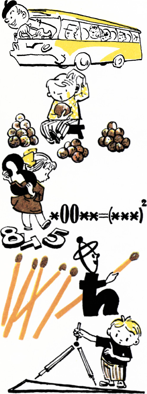 $*$ цифры в следующем равенстве $$ {*}00{*}{*}=({*}{*}{*})^2 $$ (ни одно число не должно начинаться с нуля). - В трёх кучках находится 22, 14 и 12 орехов. Требуется путём трёх перекладываний уравнять число орехов в каждой кучке, соблюдая при этом условие: из любой кучки разрешается перекладывать в другую лишь столько орехов, сколько их в этой второй кучке имеется.