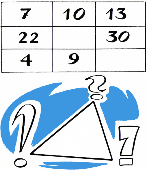 - Около каждой вершины треугольника поставьте какое-нибудь число. Напишите возле каждой стороны этого треугольника число, равное сумме чисел, стоящих у её концов. Теперь каждое число, стоящее около вершины, сложите с числом, стоящим около противоположной стороны. Почему равны все три получившиеся суммы?