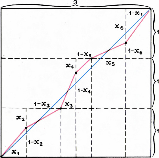 $n=3$. Длина ломаной, нарисованной красным цветом, — левая часть неравенства, длина диагонали — правая часть. Знак равенства имеет место лишь при выполнении следующих условий: $$ \begin{gathered} x_1=x_3=\ldots=x_{2n-1};\quad x_2=x_4=\ldots=x_{2n}\\ \text{и}\quad x_1+x_2=1. \end{gathered} $$ В этом случае ломаная сливается с диагональю квадрата.
