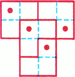 $A$, $B$ и$C$, если они лежат на одной горизонтали? - На рисунке справа изображена фигура в виде буквы Т с четырьмя отмеченными клетками. Разделите эту фигуру по линиям сетки на четыре одинаковые части, причём так, чтобы в каждой из частей было по одной отмеченной клетке.