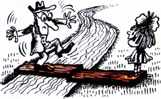 - На разных берегах ручья стоят взрослый человек и ребёнок. У каждого в руках по доске, чуть более короткой, чем расстояние между берегами. Как они могут поменяться местами?