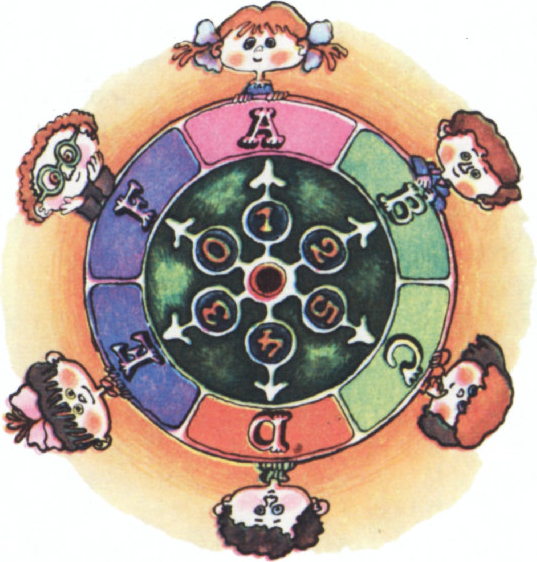 $A$, $B$, $C$, $D$, $E$, $F$ — за которым сидят 6 игроков, каждый у своего сектора (см. рисунок). В центре стола — вращающийся диск. На нём нанесены стрелки и цифры от 0 до 5, как показано на рисунке. Во время игры диск вращают 5 раз. После каждого вращения каждый игрок