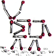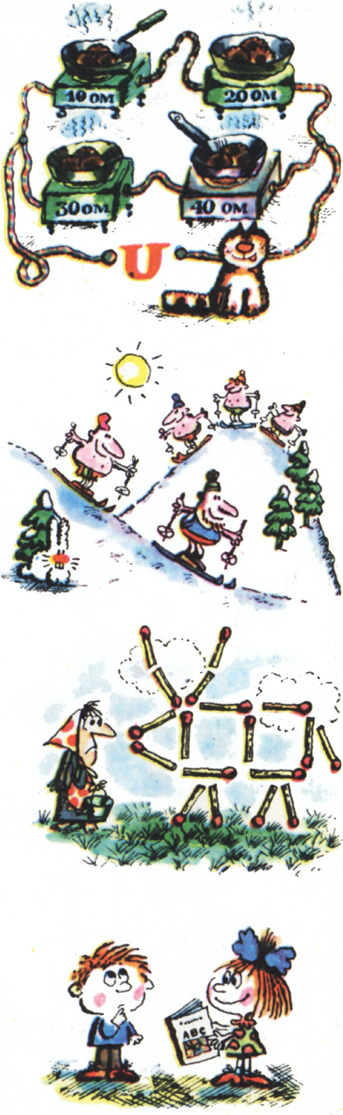 $0\celsius$. Однако зимой снег на улицах лежит и тогда, когда термометр показывает выше нуля. Как это объяснить?На рисунке вы видите корову, у которой есть всё, что полагается: голова, туловище, рога, ноги, хвост. Корова на рисунке смотрит влево. Переложите ровно две спички так, чтобы она смотрела вправо.