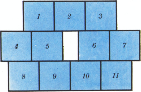 Расположите на плоскости одиннадцать одинаковых квадратов, не налегающих друг на друга, так, чтобы выполнялось следующее условие: как бы ни покрасить эти квадраты тремя красками, обязательно какие-нибудь два квадрата одного цвета будут иметь общий участок границы.