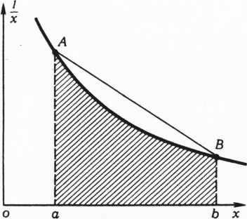 $x\to\dfrac1x$ при$x\gt0$ выпукла вниз, площадь трапеции$aABb$ (см. рисунок) больше площади заштрихованной трапеции, т. е. $$ \dfrac12\left(\dfrac1b+\dfrac1a\right)(b-a)\ge\int\limits_a^b\dfrac{dx}x= \ln x\,\Big|_a^b=\ln\dfrac ba. $$ Общий член последовательности 1, 31, 331,