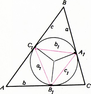 $a$, $b$, $c$ — длины сторон треугольника$ABC$, $a_1$, $b_1$, $c_1$ — соответствующие длины сторон треугольника$A_1B_1C_1$ с вершинами в точках касания виисанной в тpeугольник$ABC$ окружности (см. рисунок). Докажите, что $$ \dfrac{a^2}{a_1^2}+\dfrac{b^2}{b_1^2}+\dfrac{c^2}{c_1^2}\ge12. $$ На основании прямого кругового конуса построен цилиндр. Докажите, что при пересечении этого цилиндра плоскостью, касающейся конуса, получается эллипс, площадь которого равна боковой поверхности конуса.