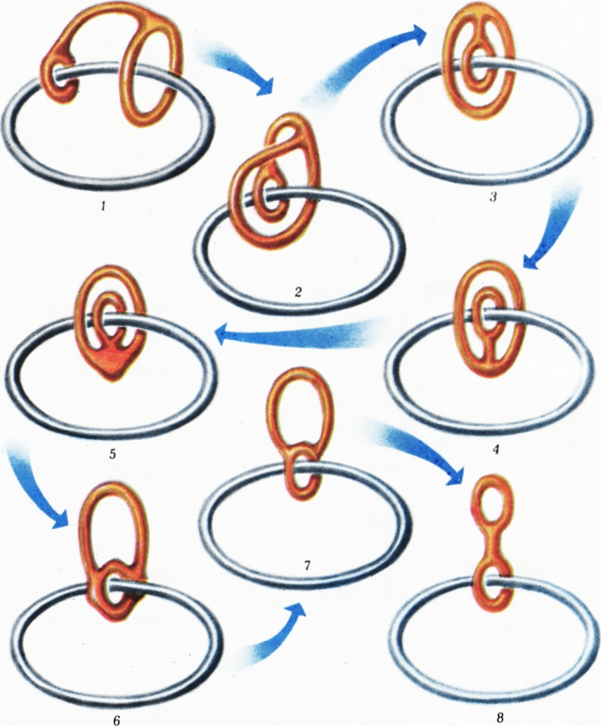 Одно ушко можно снять так, как показано на рисунке. К виду 8 можно привести и «заузленную» фигуру, помещённую на обложке снизу; это объясняется в «Кванте», 1981, № 3 на с. 14.