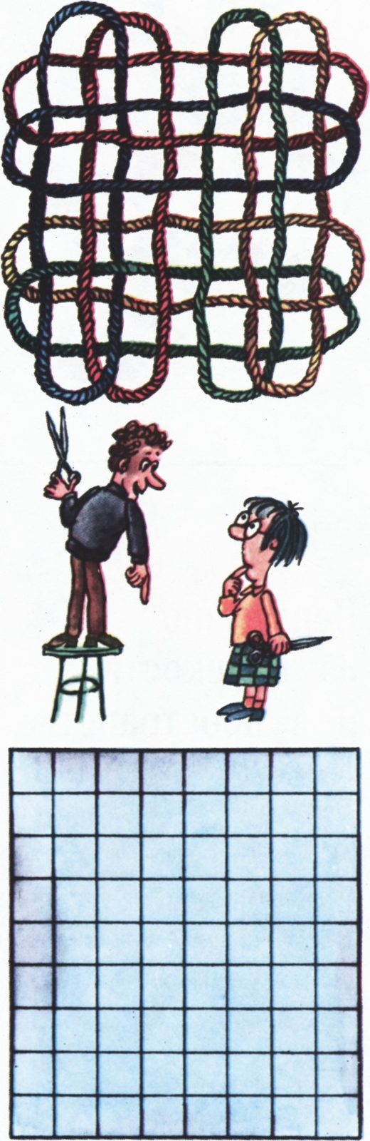 $\ldots$, 9 так, чтобы получились верные равенства. - В коврике, сплетённом из разноцветных верёвок (см. рисунок), есть верёвочное кольцо, при разрезании которого коврик распадается на три части так, что две из этих частей состоят из одинакового числа верёвок, а третья — всего из одной верёвки. Укажите это кольцо.