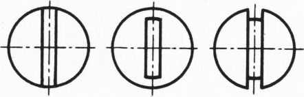 На рисунке изображены головки трёх винтов (вид сверху). Одна из этих головок имеет цилиндрическую форму, другая — форму усечённого конуса, третья — полушара. Какая — какую?