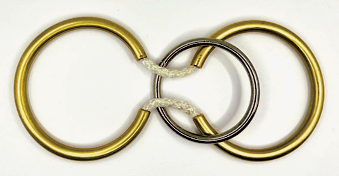 Перед вами головоломка известного японского изобретателя Асигахары Нобуюки. Задача проста — нужно снять кольцо с двух сцепленных с помощью верёвки подков. Диаметр кольца меньше диаметра подков.