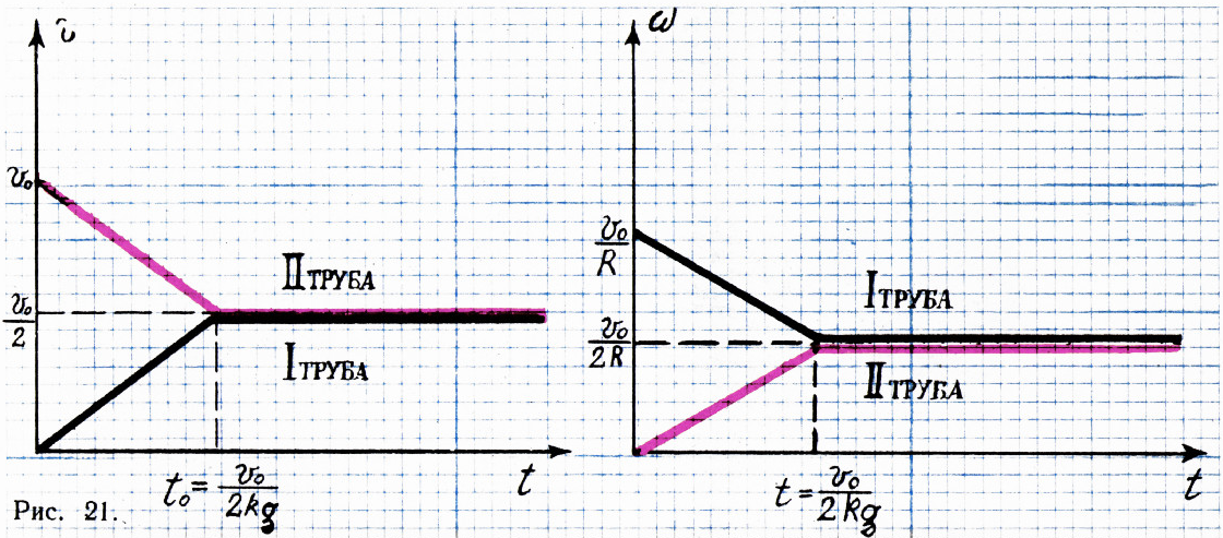 трубы $\omega_1'$, ни скорость поступательного движения оси трубы $u_1'$ уже не будут меняться. Из условия $kgt_0=v_0-kgt_0$ найдём, что $t_0=\dfrac{v_0}{2kg}$. В этот момент