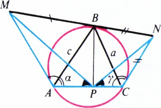 Докажем, что треугольники $APM$ и $CPN$ подобны (см. рисунок), — отсюда следует, что $\angle APM=\angle CPN$, т. е. $\angle MPB=\angle NPB$. Положим $AB=c$, $BC=a$, $\angle BAC=\alpha$, $\angle BCA=\gamma$. В равнобедренном треугольнике $AMB$ угол $MAB$ между касательной $AM$ и хордой $AB$ данной окружности равен половине величины дуги $AB$, как и вписанный угол $ACB$, т. е. $\angle MAB=\gamma$. Следовательно, $\angle MAP=\alpha+\gamma$, $AM=\dfrac c{2\cos\gamma}$. Аналогично, $\angle NCB=\alpha$, $\angle NCP=\gamma+\alpha$, $CN=\dfrac a{2\cos\alpha}$. Кроме того, $AP=c\cos\alpha$, $PC=a\cos\gamma$. Таким образом, в треугольниках $APM$ и $CPN$ равны углы $MAP$ и $NCP$ и отношения сторон: