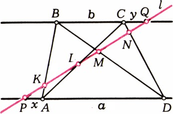 а) Если произведение первых двух отношений (*) равно 1, то $$\dfrac{PL}{LQ}\cdot\dfrac{PM}{MQ}=\dfrac{x(x+a)}{y(y+b)}=1,\quad\dfrac{PL}{LQ}=\dfrac{MQ}{PM},$$ откуда $$\dfrac{PL}{PQ}=\dfrac{MQ}{PQ},\quad PL=MQ,\quad KL=MN.$$
