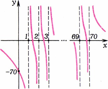 Область определения неравенства есть объединение полупрямых $(-\infty;1)$, $(70;\infty)$ и интервалов $(1;2)$, $(2;3)$, $\ldots$, $(69;70)$. Очевидно (см. примерный график на рисунке), на каждом из промежутков левая часть неравенства непрерывна и монотонно убывает: от 0 до $-\infty$ и от $\infty$ до 0, соответственно, на полупрямых, и от $\infty$ до $-\infty$ на интервалах. Следовательно, на каждом промежутке, кроме $(-\infty;1)$, она принимает значение $\dfrac54$ ровно в одной точке. Обозначим эти точки в порядке возрастания через $x_1$, $x_2$, $\ldots$, $x_{70}$, тогда множество решений неравенства есть объединение полуинтервалов $(k;x_k)$, $k=1$, 2, $\ldots$, 70. Числа $x_k$ — это корни многочлена$$