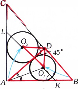 Докажем, что $AK=AL=AD$. Выполним последовательно поворот вокруг точки $D$ на угол $45^\circ$ и гомотетию с центром $D$ и коэффициентом $\dfrac{DO_1}{DB}$ (см. рисунок). Тогда точки $B$ и $A$ перейдут, соответственно, в центры $O_1$ и $O_2$ окружностей, вписанных в треугольники $DBA$ и $DAC$ ($\angle BDO_1=\angle ADO_2=45^\circ$, а $\dfrac{DO_2}{DA}=\dfrac{DO_1}{DB}$, так как треугольник $DAC$, очевидно, подобен треугольнику $DBA$). Следовательно, угол между прямыми $BA$ и $O_1O_2$ равен $45^\circ$, т. е. $\angle LKA=45^\circ$, а значит, треугольник $KAL$ — прямоугольный равнобедренный. Треугольники $AO_1K$ и $AO_1D$ равны: они имеют общую сторону $AO_1$ и равные углы ($\angle AKO_1=\angle ADO_1=45^\circ$, $AO_1$ — биссектриса угла $KAD$). Поэтому $AL=AK=AD$.