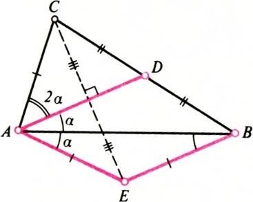 Приведём и чисто геометрическое решение. Если $E$ — это точка, симметричная $C$ относительно медианы $AD$, то, как легко видеть, $BE\parallel AD$ (см. рисунок), следовательно, $\angle EBA=\angle DAB=\angle EAB$, т. е. треугольник $ABE$ равнобедренный, причём $BE=EA=AC$. Таким образом, мы можем построить треугольник $ABE$ по сторонам, провести $AD\parallel BE$, а затем найти и точку $C$, симметричную $E$.