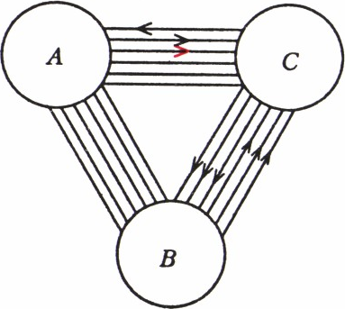 Пример легко построить, взяв за основу матч-турнир, в котором все партии $A$ с $B$ закончились вничью, все партии $B$ с $C$ результативны (причём побед и проигрышей поровну), $C$ с $A$ выиграли друг у друга по одной партии, а остальные закончились вничью (на рисунке победы изображены чёрными стрелками, ничьи — линиями без стрелок): при этом все набрали поровну очков, но побед у $C$ больше. Если число партий каждой пары не меньше 6, то слегка изменив результаты — увеличив на 1 число побед $A$ над $C$ (красная стрелка), мы получим нужный пример: матч-турнир, таблицу результатов которого вы видите перед собой, удовлетворяет всем условиям (число побед, поражений, ничьих и очков указано в столбцах $+$, $-$, $=$ и $\sum$ соответственно).