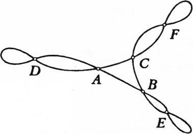 Предположим, что существует путь (по некоторым из линий на рисунке), проходящий через каждую из шести деревень только один раз. Из трёх деревень