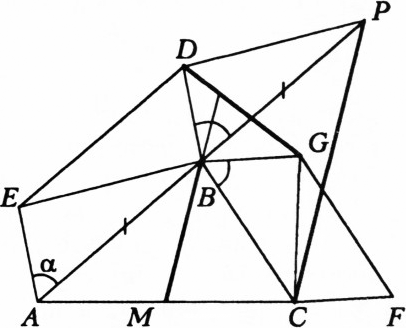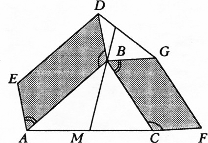 Вершины $A$, $B$ и $B$, $C$ треугольника $ABC$ служат соответственными вершинами двух подобных друг другу параллелограммов $ABDE$ и $BCFG$, построенных на сторонах $AB$ и $BC$ вне треугольника. Докажите, что медиана $BM$ треугольника $ABC$ при продолжении образует с прямой $DG$ углы, равные углам параллелограммов.