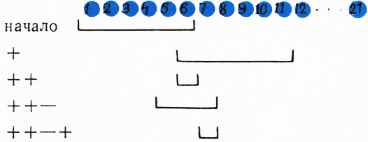 $\{\text{1—5}, \text{12—21}\}$, среди которых $\{\text{1—5}\}$ дают «+» (см. 15 шаров, «$+$»). «${+}{+}{-}{-}$» за 2 проверки 1 из $\{\text{1—4}\}$ и за 2 проверки 1 из $\{\text{8—11}\}$.