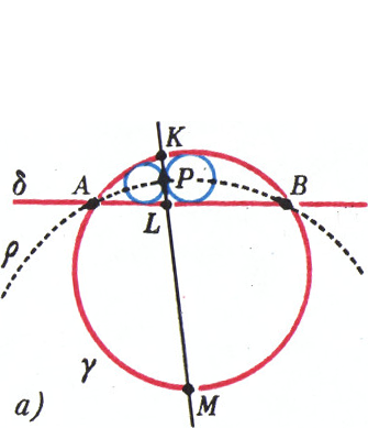 Докажем, что окружность $\rho$, образом которой служит прямая $\rho'$, — одна и та же для любой точки $P$ (хотя инверсии для разных точек $P$ будут, конечно, разными, так что рисунок 4, б зависит от выбора $P$). Заметим, что $\rho'$ делит пополам углы между $\gamma'$ и $\delta'$. Значит $\rho$ — окружность, проходящая через точки $A$, $B$, $P$ — делит пополам углы между $\gamma$ и $\delta$ (в точках $A$ и $B$), а этим условием окружность однозначно определяется.
