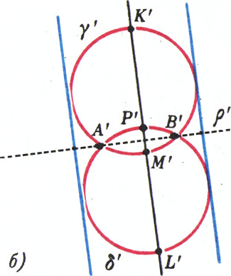 После инверсии с центром в точке $P$ из рисунка 4, а получается рисунок 4, б (при этой инверсии $P\to\infty$, $\infty\to P$, $A\to A'$, $B\to B'$ и т. д.; радиус инверсии произволен).