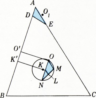 Таким образом, треугольники $OMN$ и $ADE$ конгруэнтны по двум сторонам и углу между ними. Поэтому $|KO|=|O_1A|$.