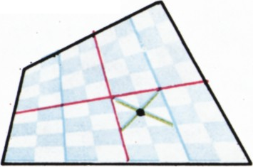 Каждая сторона выпуклого четырёхугольника разделена на 8 равных частей. Соответствующие точки деления на противоположных сторонах соединены друг с другом, и полученные клетки раскрашены в шахматном порядке. Докажите, что сумма площадей чёрных клеток равна сумме площадей белых клеток.