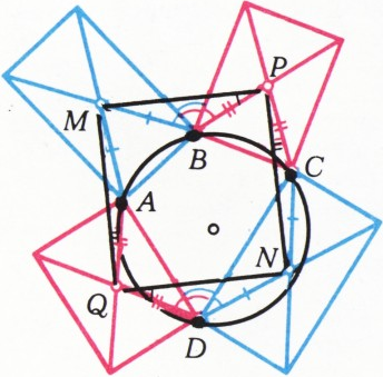 Докажем, что $\widehat{MPN}+\widehat{NQM}=180^\circ$ (отсюда будет следовать, что $\widehat{MPN}=\widehat{NQM}=90^\circ$). Эта сумма, очевидно, равна $\widehat{BPC}+\widehat{DQA}=180^\circ$, поскольку $\widehat{BPM}=\widehat{DQN}$, а $\widehat{CPN}=\widehat{AQM}$.