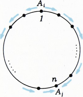 Пусть числа 1 и $n$ стоят в точках $A_i$ и $A_j$ соответственно. Будем вычислять разности соседних чисел, пользуясь рисунком: число, стоящее в начале каждой стрелки, вычитается из числа, стоящего в её конце.