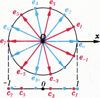 Пусть $c_k=\cos\dfrac{\pi k}7$ при $k=0$, $\pm1$, $\pm2$, $\pm3$, $\ldots$. Заметим, что $c_k$ — проекция на ось $Ox$ единичного вектора $\overrightarrow{e_k}$, образующего угол $\dfrac{\pi k}7$ с лучом $x\ge0$, $y=0$ (см. рисунок). Легко убедиться в том, что $c_{7+m}=c_{7-m}=-c_m$.