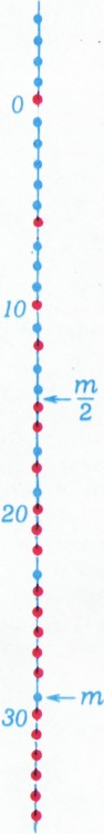 На рисунке отмечены красные и синие числа для $a=2$, $b=3$, $c=5$; здесь $m=29$. Видно, что они располагаются симметрично относительно точки $\dfrac m2$: если $u$ — красное число, то $m-u$ — синее. Из нашего решения нетрудно вывести, что так будет и в общем случае (при любых $a$, $b$, $c$): красные числа — это всевозможные значения функции $u(x,y,z)=bcx+cay+abz$ на множестве точек пространства с целыми координатами $(x,y,z)$, где $x\ge0$, $0\le y\le b-1$, $0\le z\le c-1$, а синие — её значения на множестве $x\le-1$, $0\le y\le b-1$, $0\le z\le c-1$. Эти множества симметричны, а функция $u$ — линейная, поэтому и её значения на этих множествах расположены симметрично.